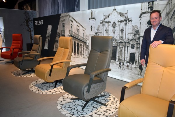 Bas Janssen van Releazz toont op de huisshow een compleet nieuwe serie relaxfauteuils onder de naam Fancy. Een vlotte collectie die als 'opstapprijs' geldt binnen het totaalassortiment van Releazz. "We maken hiervoor gebruik van een andere mechaniek, waardoor hij net iets goedkoper in de markt kan worden gezet. Maar voor de rest is alles wat je qua opties en extra’s kunt wensen mogelijk", aldus Bas.