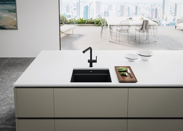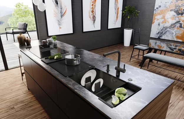 De Franke-spoelbak Kubus 2 van Fragranite in de kleur Black Matte is de perfecte metgezel is om de ideale workflow in de keuken te realiseren. De spoelbak is groter, waardoor het de perfecte ruimte biedt voor het afspoelen van borden en grotere voorwerpen; bovendien maakt de geïntegreerde plank voor accessoires het gemakkelijker om ze te gebruiken, waardoor het werk in de keuken soepeler en sneller verloopt.