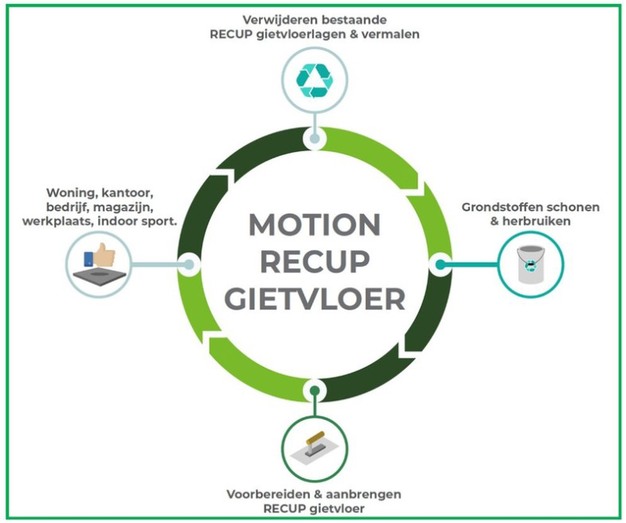 ''Motion Gietvloeren is er trots op met de Motion Recup gietvloer een gietvloer te hebben, die na gebruik ‘grondstof-schoon’ ingenomen kan worden en waarvan dus de grondstoffen herinzetbaar zijn, ongeacht hoe lang en intensief de vloer al die tijd is gebruikt. Deze vorm van terugwinnen en herinzetten van dezelfde basisgrondstoffen is inmiddels beloond met een hoogwaardig cradle to cradle certificaat. Met het opnieuw kunnen terugkrijgen van de grondstoffen is Motion Recup Gietvloer de meest vooruitlopende circulaire gietvloer van Nederland. Met de Motion Recup gietvloer is de kringloop bij gietvloeren maximaal rond, zonder de gebruikskwaliteit te kort te doen.''