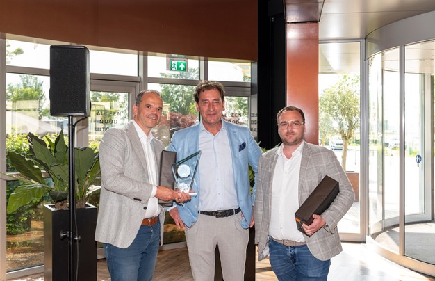 (Links) Marcel Hoogendoorn, nieuwe CEO BuitenHof Tuinmeubelen, neemt de Dofas Pluim 2023 in ontvangst van Frits Wolf (midden). Rechts Chris van Rijn van Postmus Tuinmeubelen, die ook genomineerd was voor de Dofas Pluim.