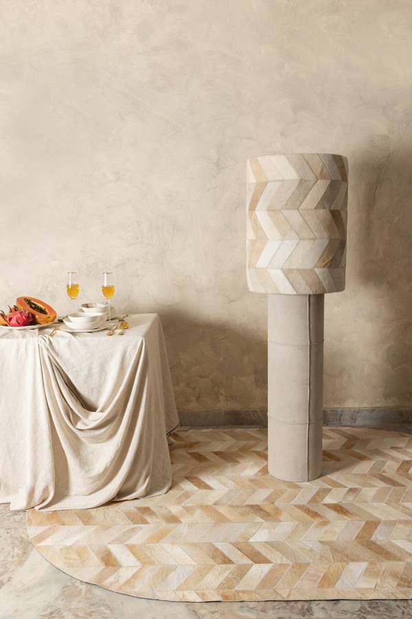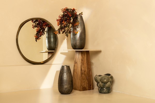 "De herfst/wintercollectie van 2023 biedt een weldaad aan kleuren, rijke materialen en zachte stoffen. Het gebruik van natuurlijke materialen zoals hout, marmer, keramiek en suède creëert een gevoel van verbondenheid met de natuurlijke elementen van het seizoen. Zo is het aanbod uitgebreid met suède vloer- en tafellampen met bijpassende karpetten. Ook zien we geweldig organisch gevormde schalen en robuuste potten die voor binnen én voor buiten geschikt zijn. Aan het assortiment textiel zijn hoogwaardige kwaliteit faux fur plaids en kussens, in gave patchwork uitvoering, toegevoegd (een bewuste keuze)."