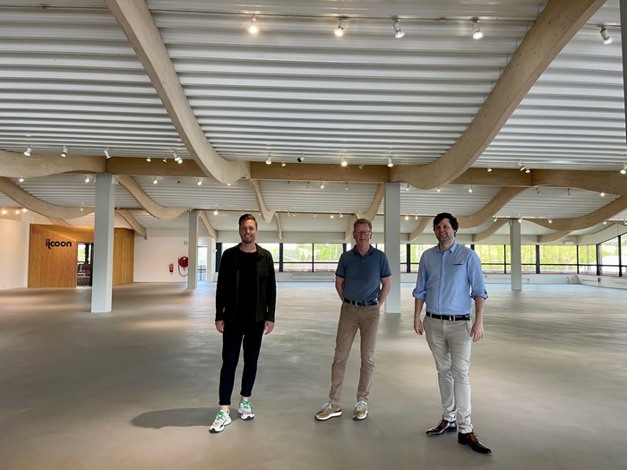De gigantische ruimte op de bovenverdieping aan de Industrieweg 1 te Beesd is helemaal leeg. Werkmannen zijn bezig de nieuwe showroom al wat vorm te geven. Het plafond knalt er duidelijk uit: golvende lijnen met constructieve houten balken, die het dak dragen. ''Waar voorheen het bijzondere plafond amper zichtbaar was, trekt dat nu direct de aandacht,'' vertellen Timon Scholten en Tom Dissel (beiden van IJcoon) en Hans Stokvis (De Toekomst) in de grote lege ruimte te Beesd.