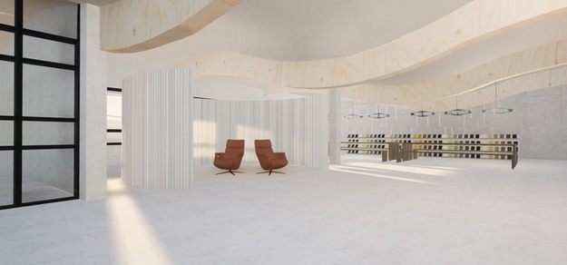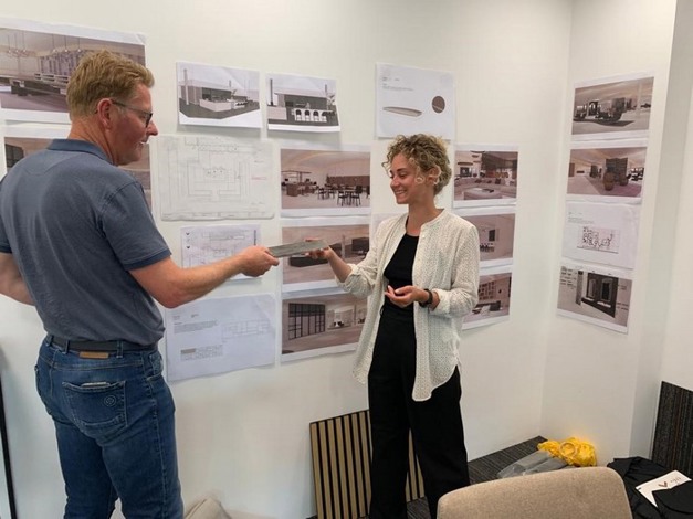 In een vergaderruimte worden diverse renders getoond, van het ontwerp dat is gemaakt door Esmee Moes, interior designer bij haar gelijknamige Studio. Nadat haar ontwerp is goedgekeurd, begeleidt ze de bouw en inrichting van het nieuwe experience center.