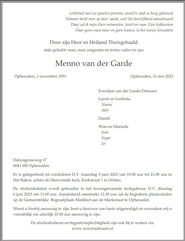 Op 31 mei jl. is Menno van der Garde op 71-jarige leeftijd onverwachts gestorven. 'Wij zullen Menno blijven herinneren als een zeer gemoedelijke, hartelijke en bescheiden man. Wij gaan hem erg missen binnen het bedrijf.' Dat meldt Van der Garde Tuinmeubelen, welk bedrijf hij samen met zijn zoon Gerrit runde.