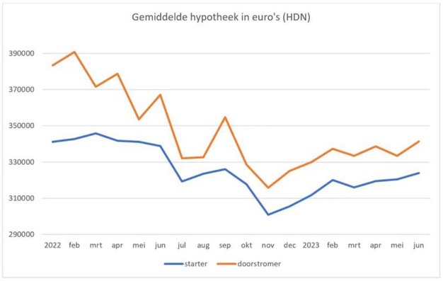 De gemiddelde hypotheeksom voor woningkopers is na een daling gedurende een groot deel van 2022 inmiddels weer met ongeveer 8% gestegen ten opzichte van november 2022. Bij starters bedraagt de gemiddelde hoofdsom in juni €323.000, terwijl deze bij doorstromers €341.000 is. Deze stijgende trend duurt inmiddels al zeven maanden en is gelijk voor zowel starters als doorstromers. Binnen de groep doorstromers kan er onderscheid gemaakt worden tussen doorstromers met en zonder meeneemhypotheek. Door de lage rente is de leencapaciteit gemiddeld €45.000 tot €55.000 hoger voor kopers die gebruik kunnen maken van een meeneemhypotheek in vergelijking met kopers die deze mogelijkheid niet hebben.