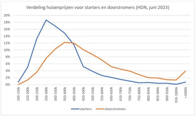 Als we de verdeling van de huizenprijzen vergelijken tussen november en juni, zien we een knik rond de €350.000 tot €400.000. Onder dit prijsniveau is er een afname, terwijl er boven dit niveau een stijging te zien is. Deze cijfers over het herstel van de woningmarkt lijken ondersteund te worden door de ervaring van makelaars, die in bepaalde gebieden (zoals Amsterdam) bijvoorbeeld weer vaker te maken hebben met biedingen boven de vraagprijs.