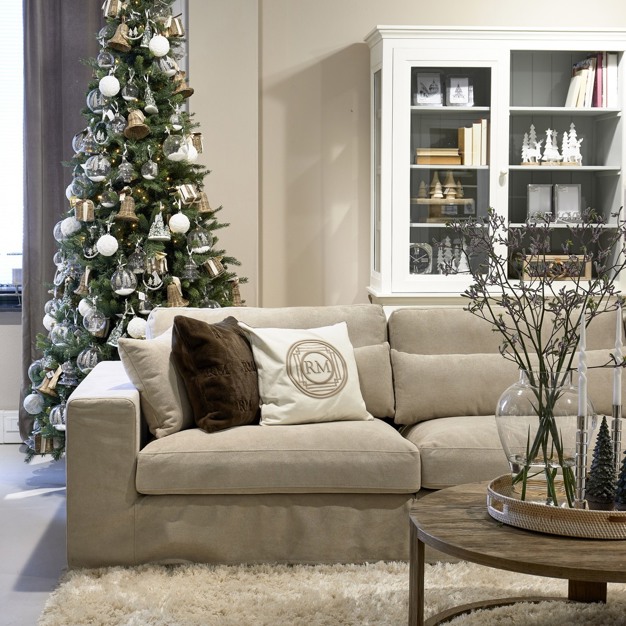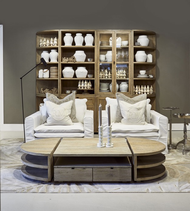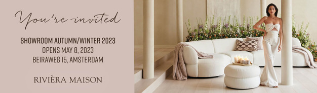 Rivièra Maison, die ook aan de komende Maison&Objet deelneemt, heeft veel geïnvesteerd in de nieuwe najaarscollectie, waarin naturals, veel lichte kleuren - maar minder zwart - en hout de boventoon voeren. Dat werpt zijn vruchten af. "We geloven sterk in handgemaakte en teruggewonnen of gerecyclede materialen zoals de nieuwe modulaire kast gemaakt van gebleekt gerecyclede eiken", vervolgt Henk, zittend naast een meterhoge kerstboom die volhangt met 'cadeautjes'. Producten die speciaal voor het 75-jarige jubileum, dus eenmalig, door het eigen designteam zijn gemaakt. Deze zijn in beperkte hoeveelheden geproduceerd, waardoor het collector-items zijn.