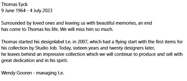 Thomas Eyck (59) is dinsdag overleden. Zijn familie heeft dat bekendgemaakt. Bij de designuitgever werd in januari longkanker geconstateerd. Hij was volgens ingewijden de belangrijkste uitgever van hedendaagse vormgevingsproducten van Nederland, uiteenlopend van vazen, tassen, meubels tot lampen.
