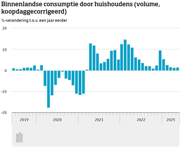 In mei 2023 hebben huishoudens 1,4 procent meer producten aangeschaft dan in mei 2022. Opnieuw kochten ze meer diensten en minder goederen .Echter hebben huishoudens vooral minder spullen voor woninginrichting, elektrische apparaten en kleding gekocht. Dat meldt het CBS.