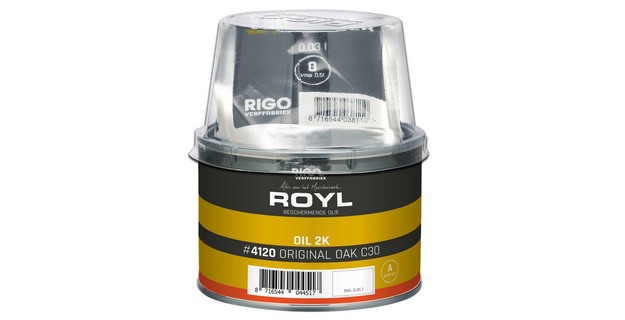 "Speciaal voor de meubelmaker ontwikkelden we een tijdje terug de ROYL Oil 2K in halve liters en op kleur gemaakt. De ready-mixed olie is een perfecte bescherming voor je meubel of aanrechtblad. Het kan in één keer worden aangebracht en drooggewreven, dus je hoeft niet in delen te werken", aldus Rigo.