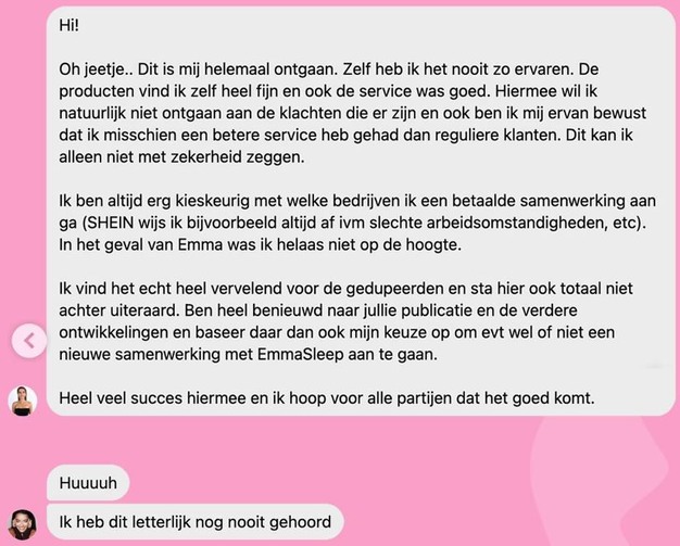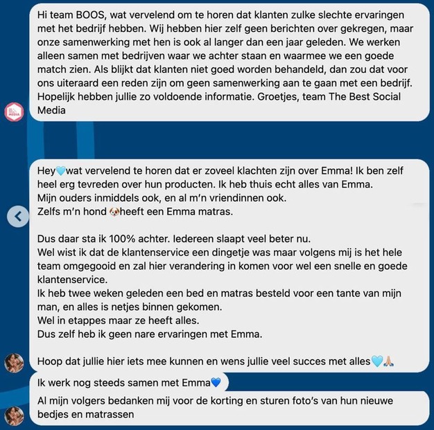 Het kost niet veel moeite om de vele klachten over Emma Sleep te vinden, schrijft de redactie van BOOS. Toch maakten hordes influencers reclame voor dit bedrijf. Daarom is BOOS benieuwd of zij nog achter hun post staan nu ze op de hoogte zijn van de klachten. Het gros van de influencers dat reclame heeft gemaakt voor Emma Slaap, reageert niet op de vragen die gesteld zijn. Toch kregen ze een aantal reacties.