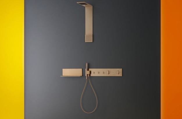 Designer Philippe Starck ontwierp voor AXOR een nieuwe douche in de ShowerComposition lijn. In het ontwerp is gebruikgemaakt van dun metaal dat verwerkt is in vlakke en strakke vormen, die de douche een hypermoderne uitstraling geven. De combinatie van het dunne materiaal en brede bedieningspanelen maakt de douche een opvallend object in de badkamer. De ShowerComposition douche door Philippe Starck is op verschillende manieren samen te stellen en verkrijgbaar in een breed kleurenpalet, bestaande uit alle AXOR FinishPlus kleuren waaronder 'Brushed Bronze', 'Polished Gold Optic' en mat zwart.