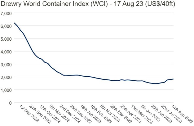 De samengestelde World Container Index van Drewry is met 2,3% gestegen tot $ 1.832,48 per 40ft container. Dit is nog altijd 70,6% lager dan in dezelfde week in 2022. De vrachttarieven op Shanghai – Rotterdam stegen met 6% tot $ 1.768 per 40ft container.