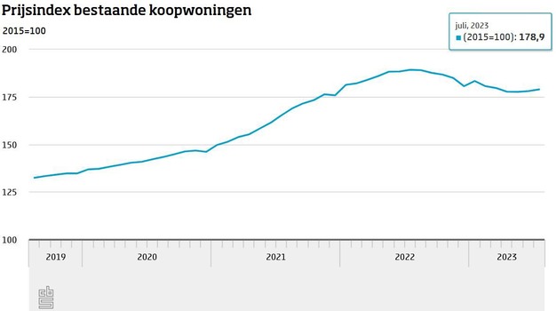 Ten opzichte van juni is de prijsindex bestaande koopwoningen in juli met 0,5 procent gestegen. De prijzen van bestaande koopwoningen bereikten in juni 2013 een dieptepunt. Vervolgens was er sprake van een stijgende trend tot augustus 2022. Toen sloeg de trend om, maar de afgelopen twee maanden zijn de prijzen weer gestegen. Vergeleken met het dal in juni 2013 waren de prijzen in juli ruim 88 procent hoger.