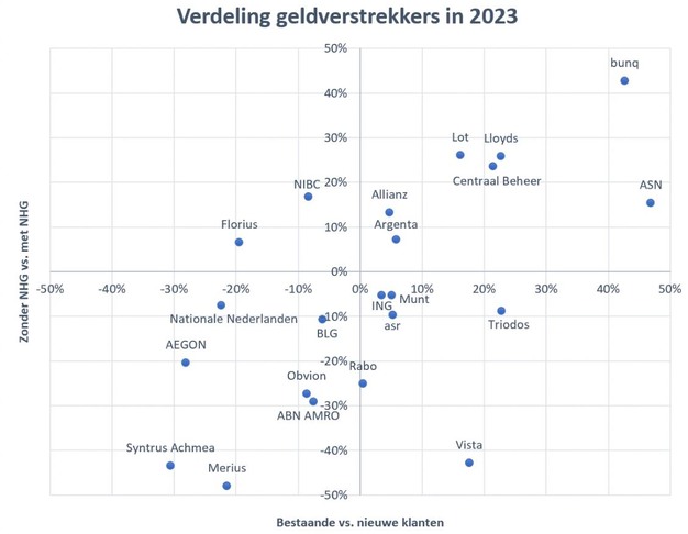 Naast de grote verschillen valt op dat veel recente toetreders tot de hypotheekmarkt (of aanbieders die recent via het intermediair verkrijgbaar zijn), die logischerwijs daardoor relatief meer nieuwe dan bestaande klanten binnenhalen, scoren op duurzaamheid. Partijen als asr, ASN (de volksbank), Triodos, bunq, Centraal Beheer (Achmea) en Lot (NIBC) staan hoog in de lijst van de Eerlijke Geldwijzer.