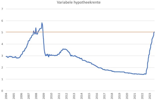 De stabiliteit die de vaste hypotheekrente dit jaar zo kenmerkt, gaat zeker niet op voor de variabele hypotheekrente. Die laatste is gelieerd aan de beleidsrente van de centrale banken, die sinds vorig jaar zomer met bijna 4%-punt is verhoogd. Hierdoor heeft de gemiddelde variabele hypotheekrente inmiddels het hoogste niveau bereikt sinds 2008, het jaar dat de kredietcrisis losbarstte. Ter vergelijking: de vaste hypotheekrente bevindt zich op dit moment op het niveau van medio 2013.