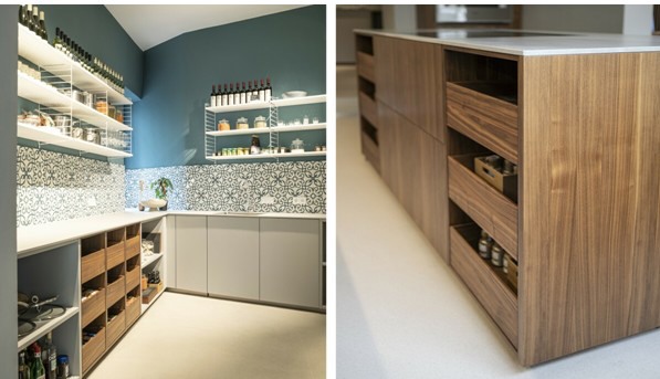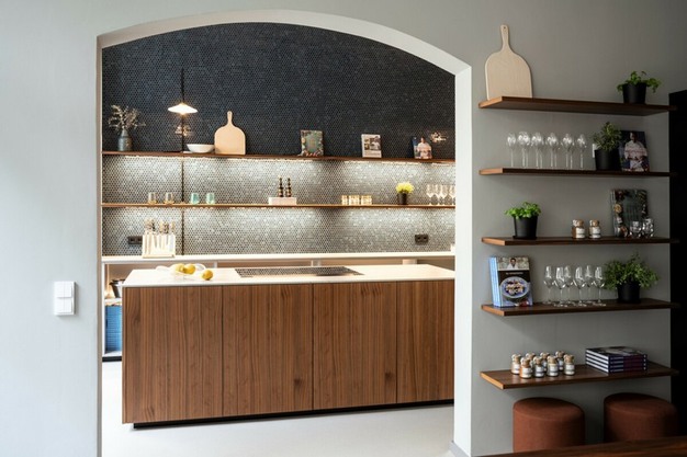 Niet alleen het mozaïek doet denken aan het Midden-Oosten, maar ook het keukenontwerp van fijn notenhout past perfect bij een Anatolische stijl, gecombineerd met het tijdloze design uit Duitsland, geïnspireerd door de Bauhaus-stijl, dat next125 zijn onmiskenbare uitstraling geeft. In deze kookschool zien we veel hout en warme tinten.