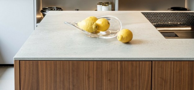 Een ander hoogtepunt in de keuken is het keramische Systemo-werkblad in tijdloos licht kwartsiet grijs. Het vormt een hoogwaardig contrast met de warme fronten van echt hout en rondt het totaalbeeld van de keuken perfect af. En dankzij de kras- en snijbestendigheid, en de hoge bestendigheid tegen zuren kunnen hier jarenlang allerlei meze en andere specialiteiten uit de oosterse en internationale keuken worden bereid en geserveerd: dit werkblad laat niemand in de steek.