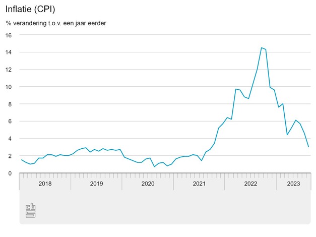 Een inflatie van 3,0 procent in augustus 2023 betekent dat de prijzen van consumentenproducten 3,0 procent hoger zijn dan in augustus 2022. De inflatie van 3,0 procent in augustus komt dus niet bovenop de inflatie van 4,6 procent in juli.