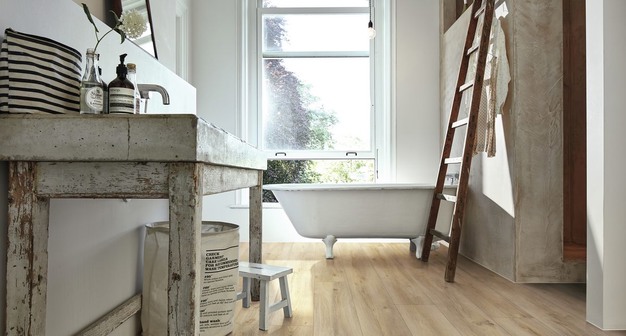 Wat is de klassieke vloerbedekking voor een badkamer? Lange tijd was het antwoord op deze vraag duidelijk: tegels. Als je niet van tegellook houdt of bang bent voor tijdrovend tegelwerk, heb je met waterbestendig laminaat, designvloeren en zelfs houten vloeren van Meister het geschikte vloeralternatief voor de badkamer - in hout- of steen-look.