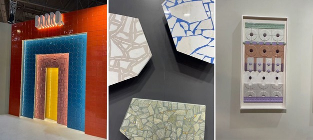 Dit jaar kon je op de beurs niet om de gekleurde tegeltjes heen, ook waren ze in alle vormen, materialen en maten te zien. Deze drie exposanten sprongen eruit: