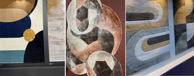 De met egale kleuren rechthoekig vloerkleden waren bijna niet te vinden in Parijs. De grote vormen met kleur en rondingen kwamen wij veel tegen bij de verschillende exposanten. Wij hebben er drie uitgelicht:
