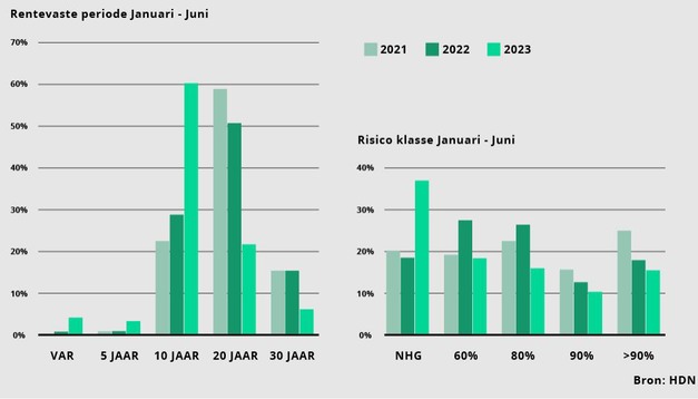 Het marktaandeel van hypotheken met kortere looptijden (≤10 jaar) is in de eerste helft van 2023 gestegen naar 70% (2021: 30%, 2022: 20%). Het marktaandeel van hypotheken met langere looptijden (>10 jaar) is afgenomen naar 30% (2021: 70%, 2022: 80%).