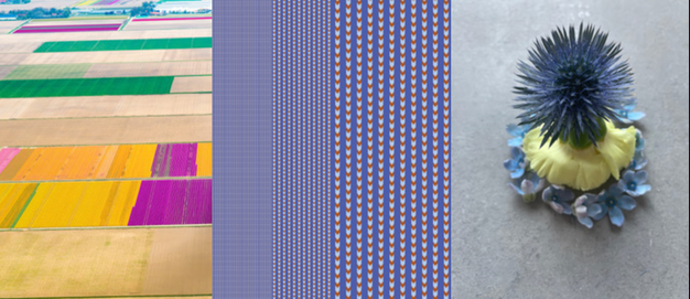 Studio Truly Truly: “We zijn gefascineerd door hoe kleur zich gedraagt en de genuanceerde manier waarop de natuur kleur aanbiedt en ermee omgaat. Een saaie emmer maakt de bloemen die erin zitten nog feller. Van een afstand veranderen de rijen bloemen in strepen van een kleur die bestaan uit bloemblaadjes en groene bladeren.”