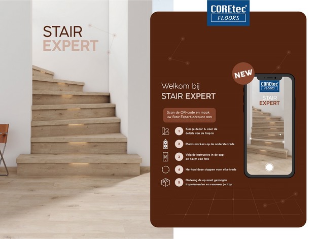 "Dankzij Stair Expert wordt traprenovatie toegankelijk voor elke verdeler, en voor zo goed als elke trap," zegt Mathias De Ruyck, Product Manager bij COREtec® Floors. "Het nauwkeurige inmeetsysteem zorgt ervoor dat de trapdelen perfect passen, waardoor het verzagen van trapelementen op locatie niet meer nodig is. Een standaardtrap kan zo in slechts 2 à 3 uur tijd gerenoveerd worden. Win-win dus!”