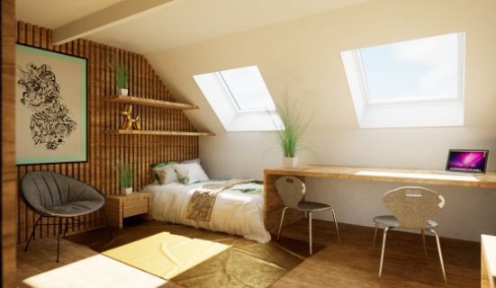VELUX wil haar klanten het grootst mogelijke comfort bieden. Zo kan een zolder van 7 m² worden omgetoverd tot een complete en flexibele woonruimte, waarbij natuurlijk licht en frisse lucht de hoofdrol spelen. Dit alles met behoud van de 2m plafondhoogte zodat een volwassene van gemiddelde grootte gemakkelijk kan bewegen.