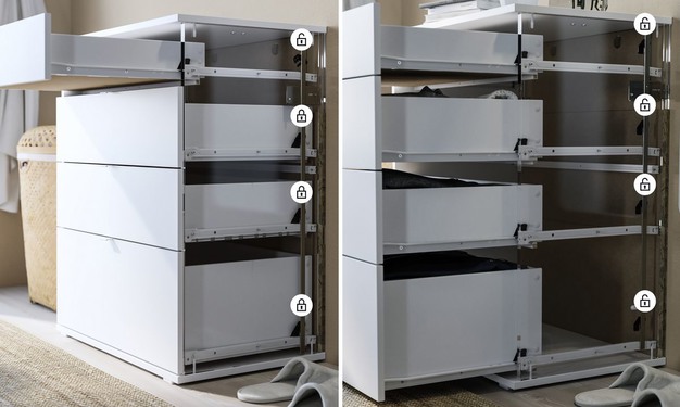 Productveiligheid heeft bij IKEA de allerhoogste prioriteit. Het woonwarenhuis raadt klanten met klem aan om ladekasten altijd aan een wand te bevestigen om het risico op kantelen te verlagen. Omdat dit niet altijd gebeurt, bedacht IKEA het ‘Anchor and Unlock’-systeem. Een kast met dit systeem valt minder snel om omdat er slechts één lade tegelijk geopend kan worden, tenzij de ladekast wordt bevestigd aan de wand.