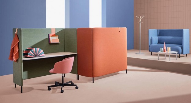 Op de stand van de Italiaanse producent Pedrali waren allerlei soorten meubelen te bewonderen. Allemaal zijn ze gericht op de veranderende werkruimte. Evelien legt uit dat de trend 'verzachting' overduidelijk terugkomt in de designs. "Vroeger waren kantoren erg mannelijk, maar je ziet dat er meer vrouwelijke accenten aan toegevoegd worden. Bijvoorbeeld door het gebruik van zachtere kleuren en ronde vormen. Hierdoor ontstaat er een balans; niet mannelijk of vrouwelijk. Je zou kunnen zeggen dat het interieur non-binair wordt."