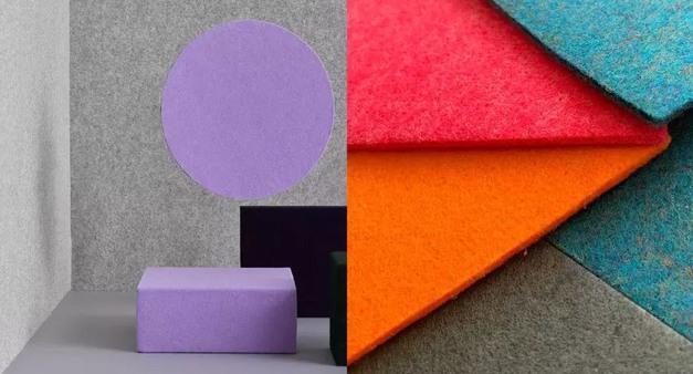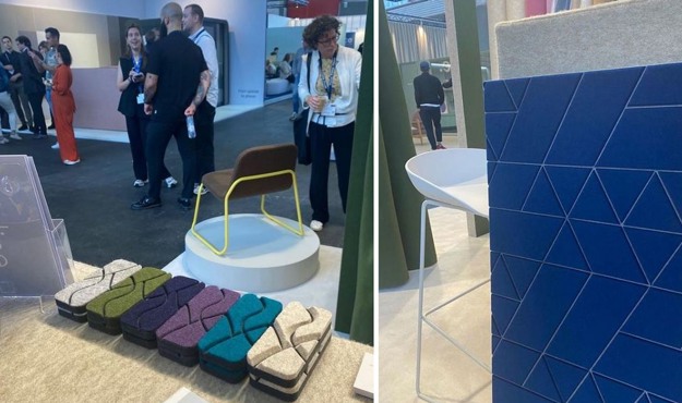 "Féline is gespecialiseerd in duurzame en akoestische stoffen voor interieur- en productdesign", legt Renske uit, terwijl ze de wandbekleding aanwijst in de stand. "We hebben duurzame Vilt collecties van wol en gerecyclede PET-flessen, verkrijgbaar in een breed scala aan kleuren en diktes." Féline beschikt in Amsterdam over een eigen machine park. Een groot deel van de collectie is direct uit voorraad leverbaar.