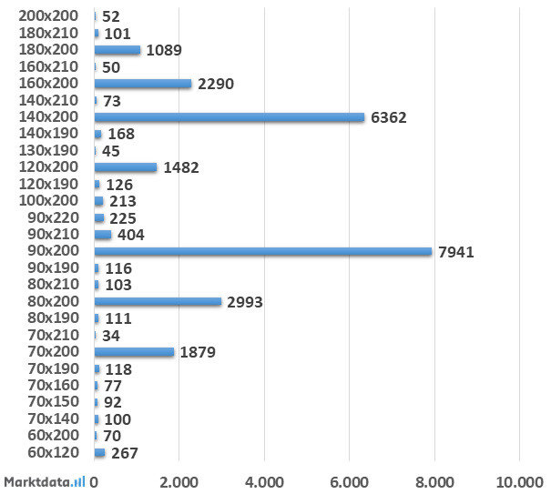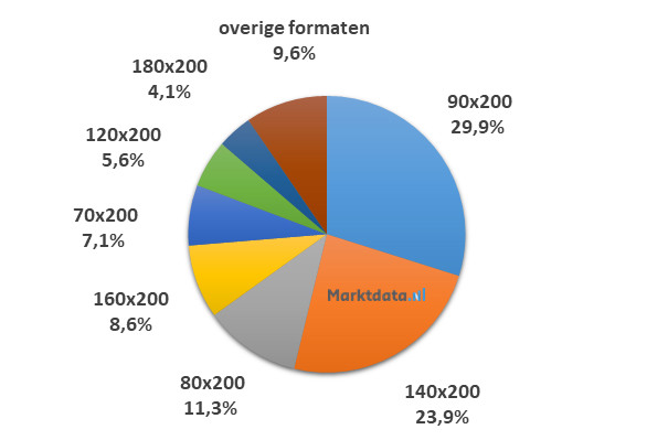 Bijna 30 procent van het zoekvolume met formaat aanduiding heeft betrekking op 90x200 cm. Op de tweede plaats staat 140x200 cm met een aandeel van 23,9 procent in het zoekvolume. De nummer drie is het formaat 80x200 cm, die 11,3 procent van het zoekvolume vertegenwoordigt.