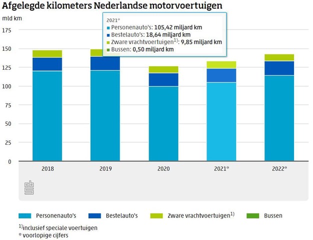 Nederlandse motorvoertuigen (exclusief motor- en bromfietsen) reden in 2022 in totaal 143,8 miljard kilometer in binnen- en buitenland. Dat is 7,0 procent meer dan in 2021, maar minder dan in 2019, het jaar voorafgaand aan de coronapandemie. Toen legden Nederlandse motorvoertuigen 150,1 miljard kilometer af. Er waren in 2022 2,9 procent meer Nederlandse motorvoertuigen in gebruik dan in 2019. Dat meldt het CBS op basis van nieuwe cijfers.