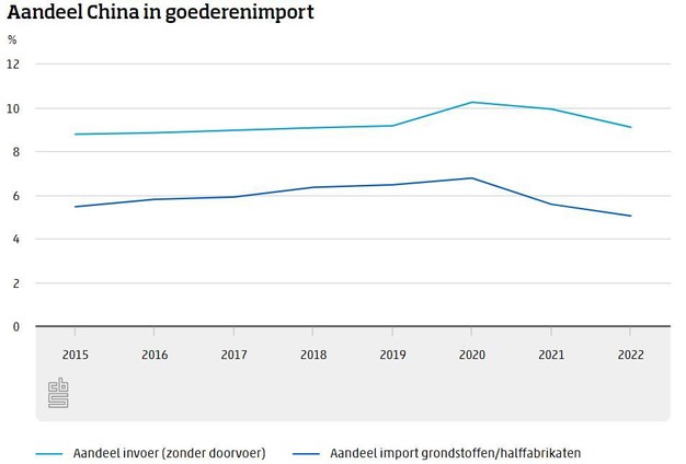 Het aandeel van China in de import van goederen (zonder doorvoer) kwam in 2020 voor het eerst boven de 10 procent uit. In 2022 was dit weer gedaald naar 9 procent. Ook haalden Nederlandse bedrijven relatief minder grondstoffen en halffabricaten uit China. In 2020 kwam nog 6,8 procent hiervan uit China. In 2022 was dit gedaald naar 5,1 procent, lager dan in 2015 (5,5 procent).