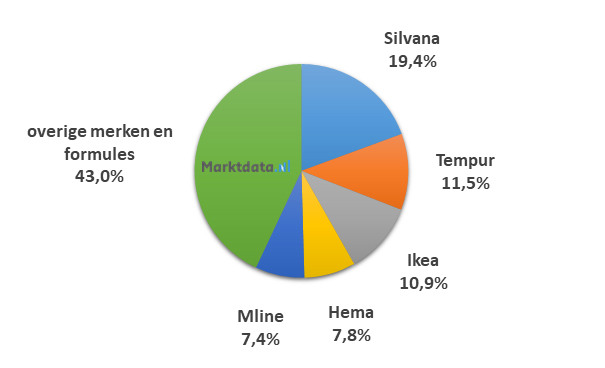 19,4 Procent van het zoekvolume naar merken en winkelformules op het gebied van kussens komt voor rekening van Silvana. Op de tweede plaats staat Tempur met 11,5 procent van het zoekvolume, gevolgd door Ikea met 10,9 procent. In het onderzoeksrapport worden tevens de marktaandelen en verschuivingen per jaar getoond.