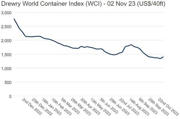 De samengestelde World Container Index van Drewry, waar alle vier de grote handelsroutes meegerekend worden, steeg met 5% tot $1,406 per container.