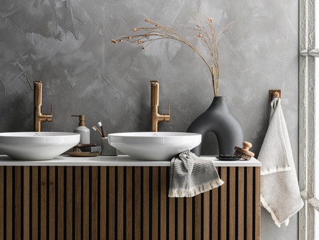 De trend van Scandinavische en Japandi stijl badkamers blijft in 2024. Hierbij hoort een minimalistische en lichte uitstraling, waarbij contrast wordt aangebracht met details en accessoires in goud, roest of zwart, zoals bijvoorbeeld Gun Metal kranen. De Grohe Colors producten in onder andere de kleur Hard Graphite zorgen voor een luxe en stijlvolle uitstraling van je badkamer, waarbij ook daglicht goed tot zijn recht komt.