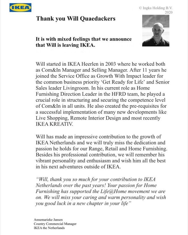 "Na 20 jaar verlaat ik IKEA met gemengde gevoelens. Ik heb tijdens mijn carrière de meest geweldige mensen ontmoet en met hen gewerkt. Ik heb de kans gehad om aan mijn eigen ontwikkeling te werken en mijn carrièrepad te creëren. Ik kijk terug op een geweldige tijd in een fantastisch bedrijf en omgeving, en misschien kruisen onze wegen elkaar nog een keer. Al het beste en bedankt voor alle vreugde, geluk en prestaties die we in de loop van de 20 jaar hebben geleverd", aldus Will Quaedackers.