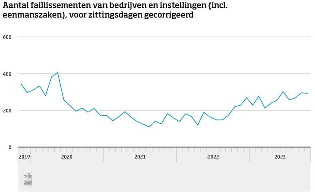 In oktober zijn, voor zittingsdagen gecorrigeerd, vier minder bedrijven failliet verklaard dan in september, meldt het CBS. Dat is een daling van 1 procent. De trend van het aantal faillissementen is echter ruim een jaar stijgend. In de eerste tien maanden van 2023 zijn ongeveer 60 procent meer bedrijven failliet verklaard dan in dezelfde periode van 2022.