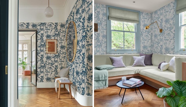 Inktblauw behang Esther van Graham & Brown is een organisch ontwerp geïnspireerd op de Britse wilde weiden. In de Ink uitvoering heeft het behang een inktblauwe kleurstelling en een katoenen textuur als ondergrond. Hierop pronken reusachtige schermbloemen met karakteristieke platronde bloemschermen. De uitvoering in lichtblauw (Esther Breath) vormt eveneens een stijlvolle basis voor vele kleurrijke interieurs.