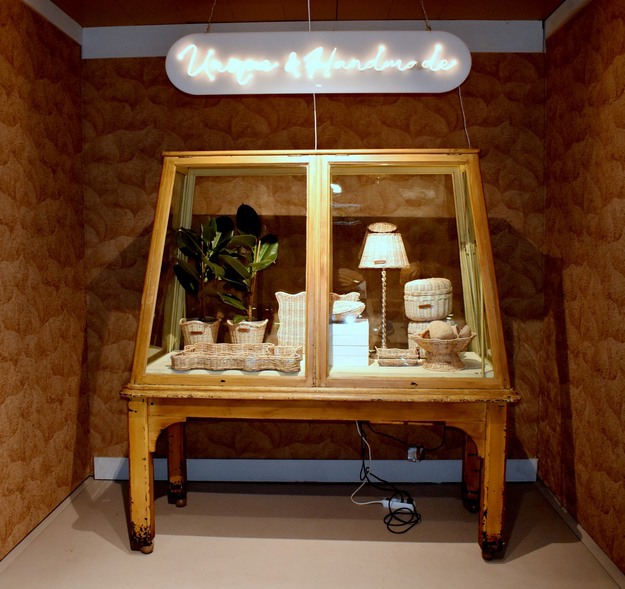 De collectie van Rivièra Maison kenmerkt zich door het vele gebruik van rustiek rattan, maar dat nu een mooie lichte kleur heeft gekregen geheel in de nieuwe look & feel dat hier o.a. in een oude vitrinekast wordt getoond.