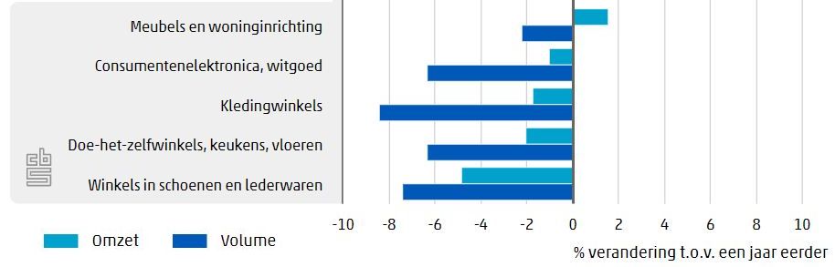 Het verkoopvolume was voor het zesde kwartaal op rij lager dan een jaar eerder. Vanaf het tweede kwartaal 2022 verkopen detailhandelaren minder. De omzetstijging in deze kwartalen kwam door hogere prijzen.