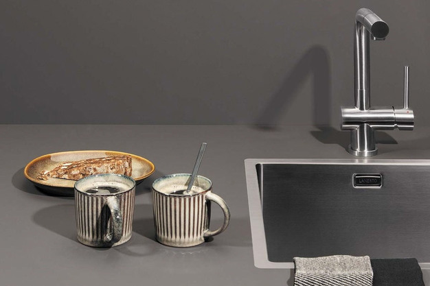 Grigio Aragona is namelijk ook verkrijgbaar voor achterwanden en keukenkastjes, wat samen een uniform en exclusieve