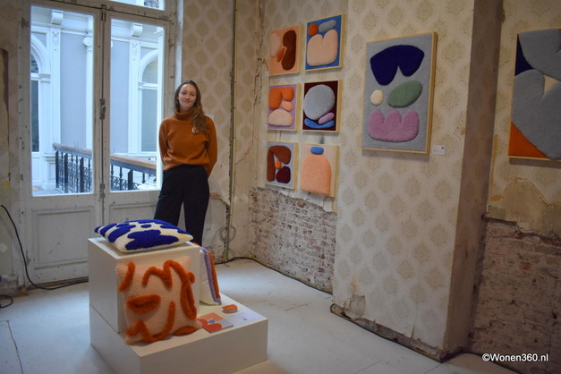 Studio Mirte presenteerde wandkleden die worden gemaakt met de techniek tuften. “Ik kan dit maximaal vier uur per dag doen, want het is fysiek wel zwaar. Dan is het een kwestie van scheren, knippen en bijwerken,” zegt de ontwerpster Mirte van Kooten.