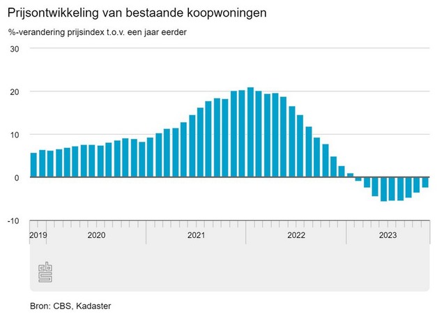 In oktober 2023 waren de prijzen van bestaande koopwoningen gemiddeld 2,3 procent lager dan in oktober 2022. De prijsdaling vlakte daarmee opnieuw af. Ten opzichte van september 2023 stegen de prijzen in oktober met 0,7 procent. De prijsontwikkelingen in dit bericht zijn gebaseerd op de prijsindex van bestaande particuliere koopwoningen in Nederland van het CBS en het Kadaster.