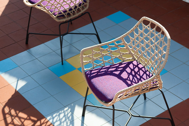 De nieuwe Cut stoel en fauteuil volgen dit concept van elegant minimalisme, en maken de outdoorverzameling compleet. Het stalen staaf frame, gekleurd in epoxy power coating wordt gecombineerd met een handgeweven omhulsel in gassa touw en zachte contrasterende kussen.