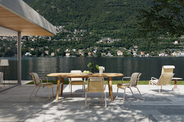 Deze buitenverzameling bestaat uit teakhouten tafels, stapelbare fauteuils, een clubfauteuil en lounge clubfauteuil in buitenriet, en een buiten rotan eetfauteuil.