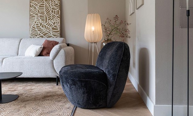 "Imperfectie wordt nog altijd als ultieme schoonheid gezien. Deze trend omarmt de elegantie van gebogen lijnen en organische vormen. Banken met zachte, afgeronde hoeken voegen een speelse en verfijnde touch toe aan ieder interieur. Kijk maar naar bank Fenn met zijn rond aflopende longchair en armleuningen. Samen met salontafels Dain creëert hij een knusse sfeer in Thera’s woonkamer."